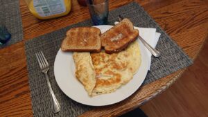 朝食は、オムレツとトーストを作ってくれました。調味料も豊富で、味濃いめ好きの私にとってはカナダの料理はおいしいです!