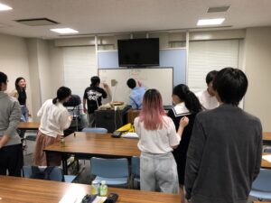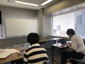 まずは、集団授業です。英会話であったり、大学のゼミナール形式でのディスカッションをやっております。
