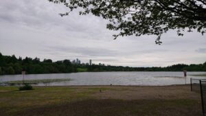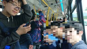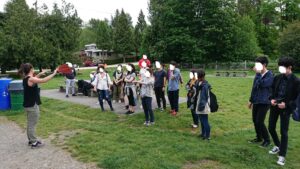 アクティビティの外国人の先生が引率で学校から湖へ向かいます。電車、バスを乗り継いで移動しました。