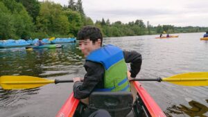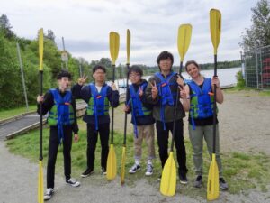 アクティビティの先生に、シーカヤックの乗り方を英語で教えてもらいさっそく乗ってみます!