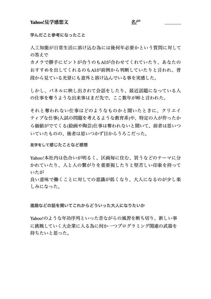 その後、生徒達には感想文を作成して頂きましたが、