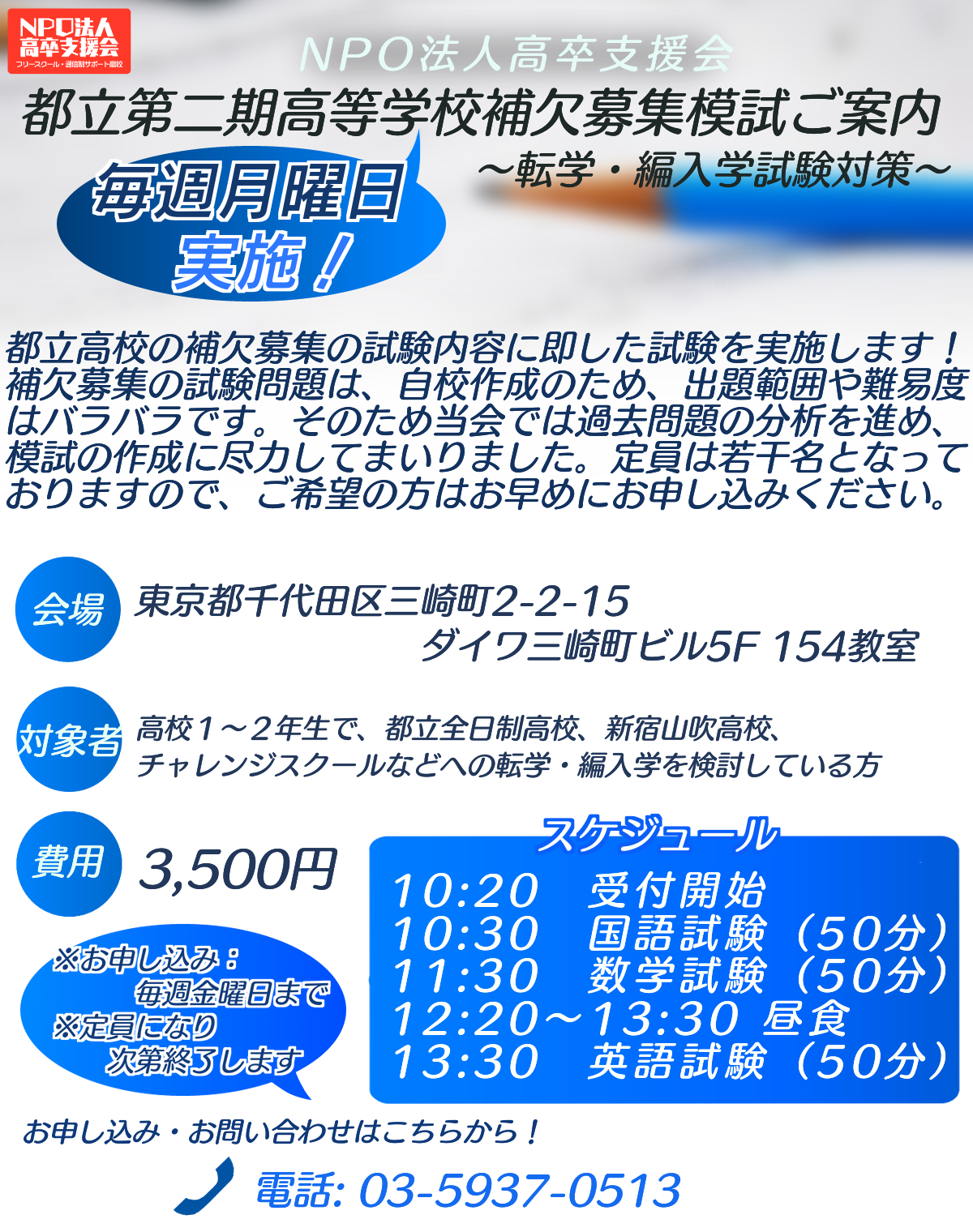 NPO法人高卒支援会では、前身の塾時代から継承してきた都立高等学校第二学期募集試験対策模試を毎週月曜日に実施しております。