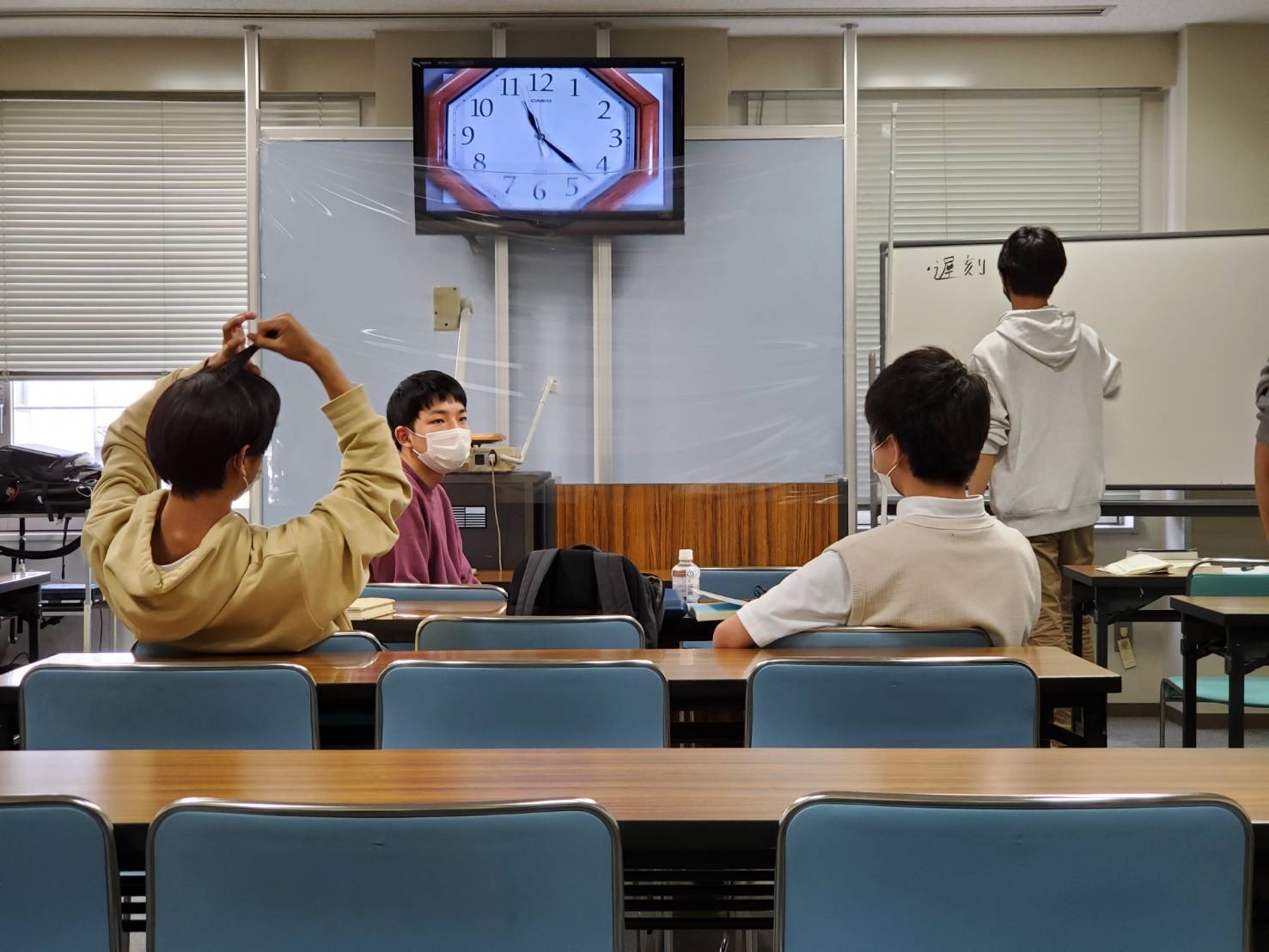 4人のうち誰かが遅刻したら携帯没収をしたらどうだ?と話しました。それだとどうなんだということで、話し合っている最中の写真を撮りました。