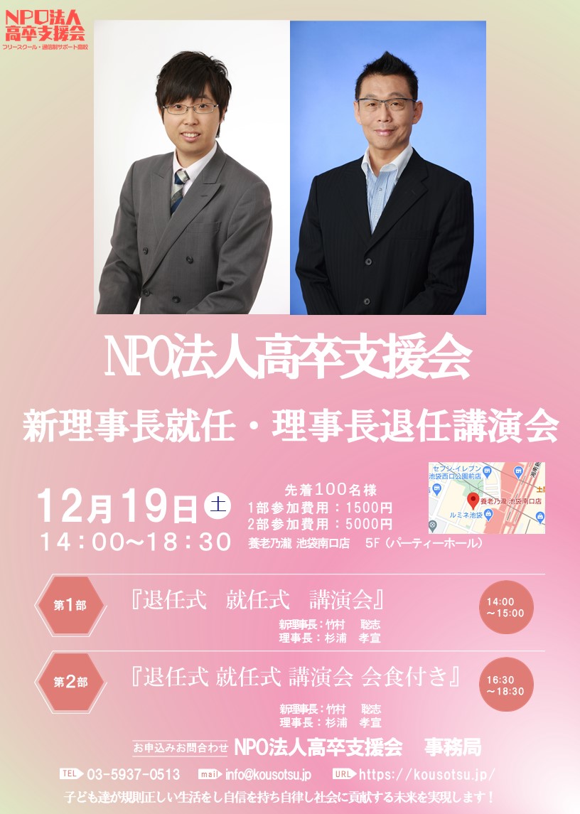 皆さんこんにちは!NPO法人高卒支援会理事長の竹村です。