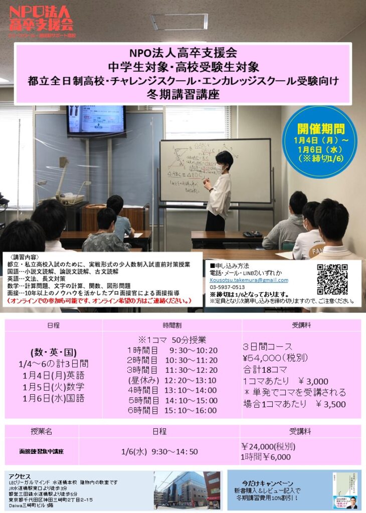 1月4日~6日まで 中学生の不登校・高校受験向けの冬期講習を実施しますので、学力面で不安な方はこちらにご参加ください。