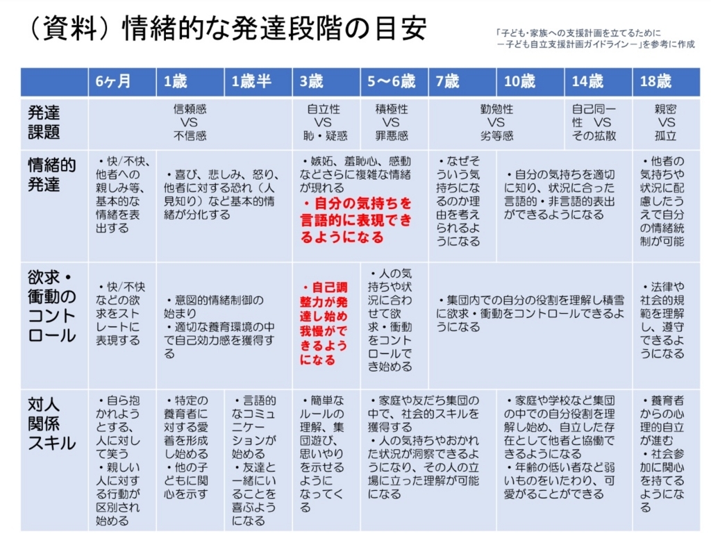 (エリクソン、ピアジェなどの心理学者がまとめた発達段階における年齢別目安をまとめたものを貼っておきます。)