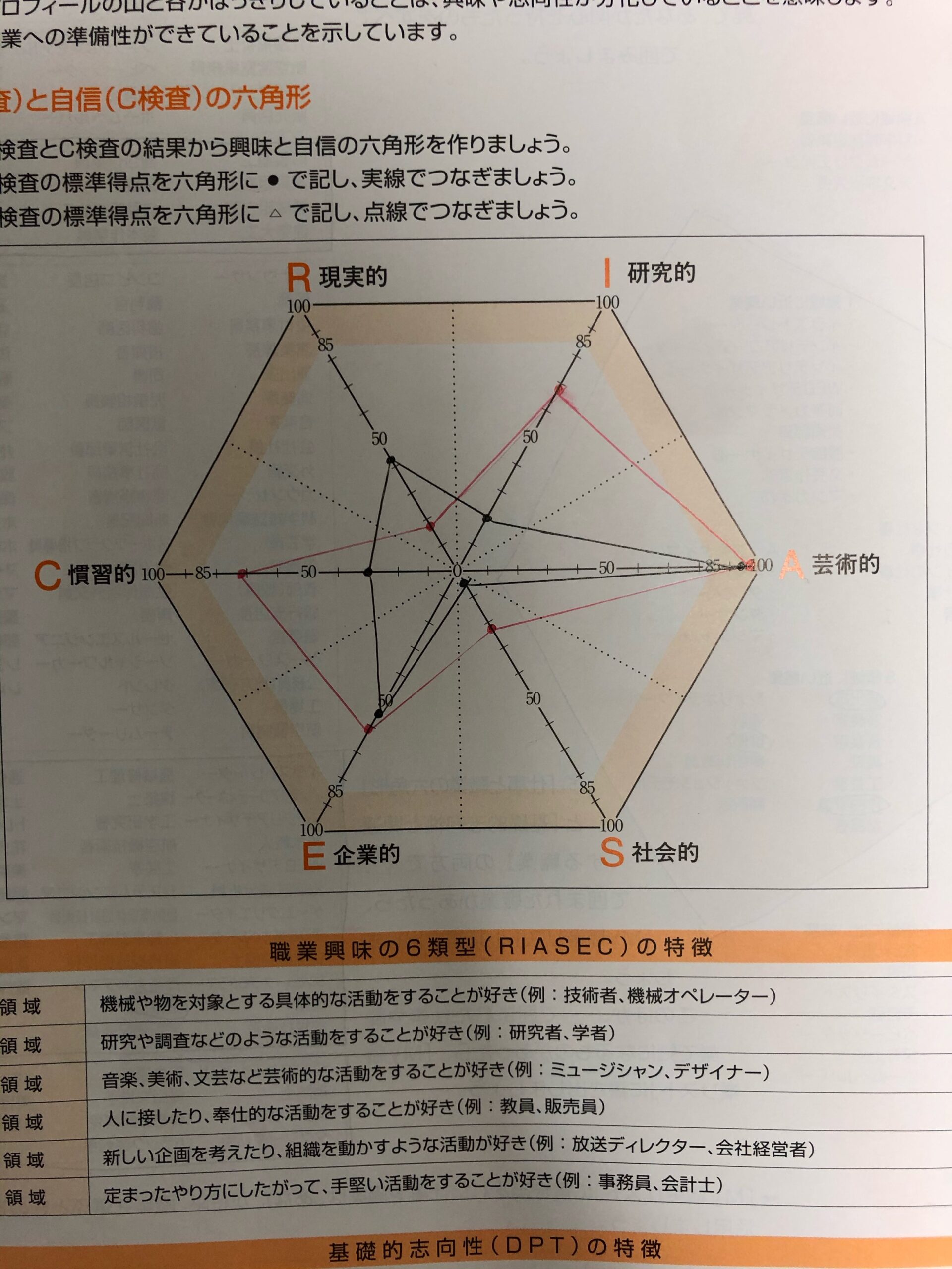 を実施しました。心理テストを答えていくとスコアが表示され、RIASECという六角形を反映させて自分の適性を確認します。