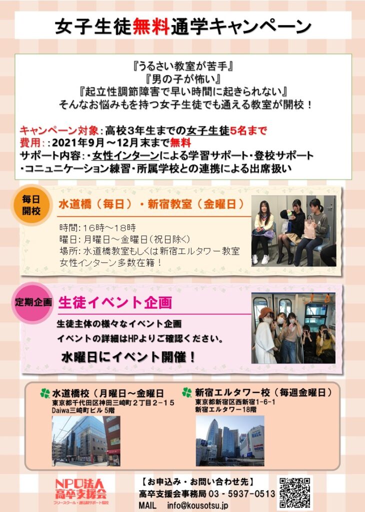 女子生徒無料で通学できるフリースクール 千代田区・新宿区のフリースクール