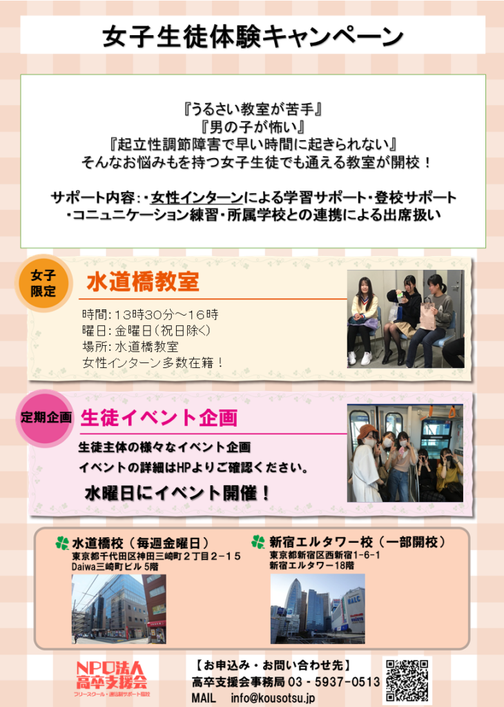 スタッフ募集はこちら 寄付はこちら 渋谷区フォロースタッフ(訪問員)・世田谷区要保護児童協議会構成員として相談受け付け中です! 新宿、池袋、横浜、千代田区水道橋教室にて不登校、引きこもり、転学・編入学、通信制サポート校、フリースクールの相談を承っております!お気軽にお問い合わせください。 不登校,引きこもり支援の日常、よくある相談にお答えするNPO法人高卒支援会の公式youtubeチャンネル登録、高評価のほう宜しくお願いします! noteにて、不登校・引きこもりの、支援の正しいありかた・予防法を発信します! 小、中学生の居場所がコロナの影響で奪われています。当会のフリースクール部門としては、東京近郊の休校している小学校、中学生の居場所として朝から開室しております。