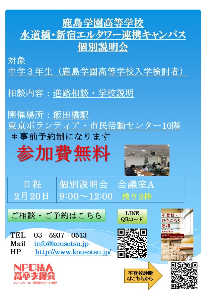 2022年2月20日(日)通信制の仕組みもわかる 鹿島学園高等学校新宿・水道橋連携キャンパス「個別相談会」