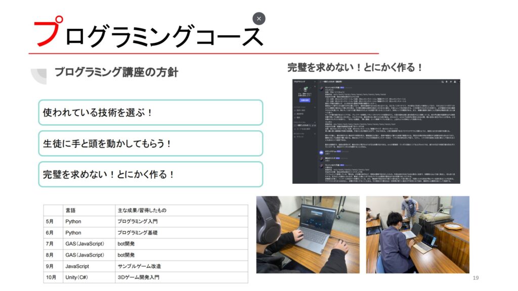 では高卒支援会の生徒はどうか、驚く方も多いと思いますが、基本的は言語の習得から、bot作成やアプリ開発まで取り組んでいる子も多いです。