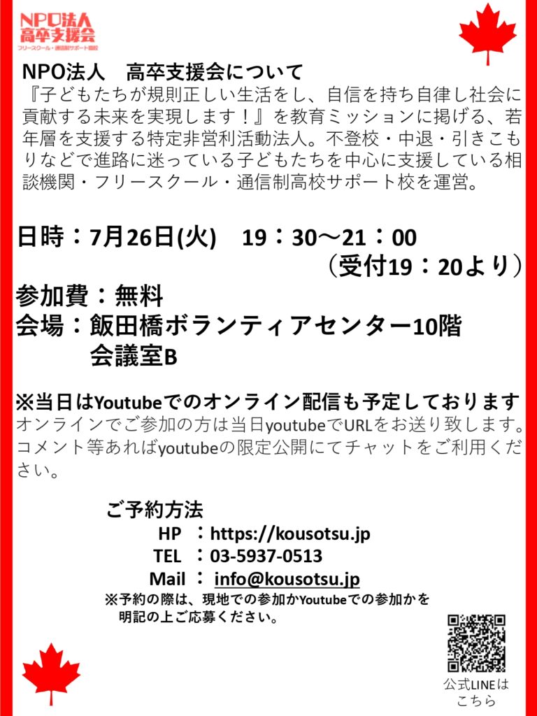 スタッフ募集はこちら 寄付はこちら 渋谷区フォロースタッフ(訪問員)・世田谷区要保護児童協議会構成員として相談受け付け中です! 新宿、池袋、横浜、千代田区水道橋教室にて不登校、引きこもり、転学・編入学、通信制サポート校、フリースクールの相談を承っております!お気軽にお問い合わせください。 不登校,引きこもり支援の日常、よくある相談にお答えするNPO法人高卒支援会の公式youtubeチャンネル登録、高評価のほう宜しくお願いします! noteにて、不登校・引きこもりの、支援の正しいありかた・予防法を発信します! 小、中学生の居場所がコロナの影響で奪われています。当会のフリースクール部門としては、東京近郊の休校している小学校、中学生の居場所として朝から開室しております。