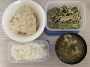 ごはん、チキン南蛮、ピーマンともやしのナムル、味噌汁