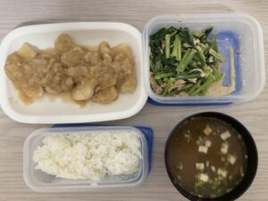 ごはん、鶏の甘辛みぞれ煮、小松菜ツナマヨ和え、味噌汁