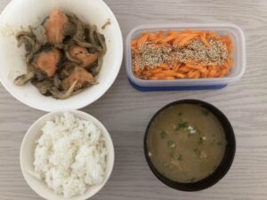 ごはん、鮭とマイタケのバター醤油炒め、酢にんじん、味噌汁