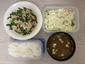 ごはん、豚ニラ炒め、コールスロー、味噌汁