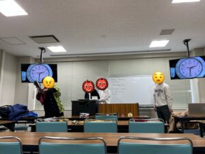 4人のグループで登場人物(鬼、福の神、子どもなど)とセリフを考えさせ、発表させるという形式でした。初めてということもあり英語で台本を書くのに25分かかりました。