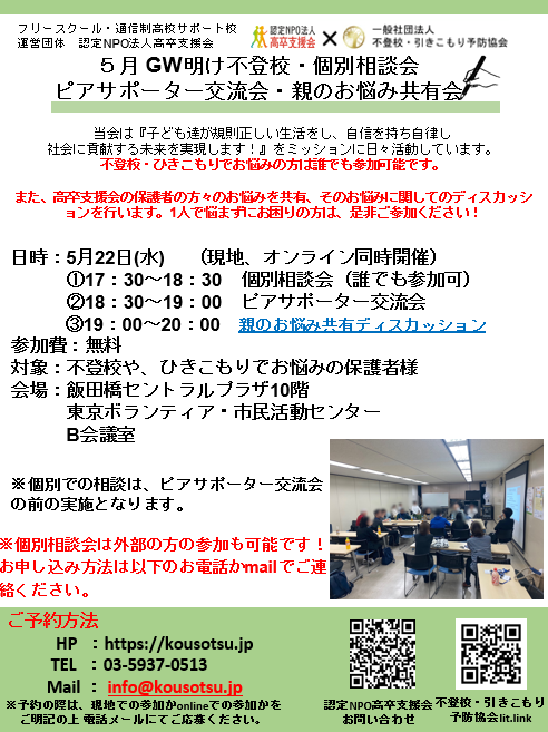 5月GW明け不登校・個別相談会・ピアサポーター(保護者)交流会・お悩み共有会