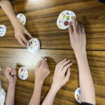 今回やったゲームは『ドブルキッズ』。55枚の丸いカードにおもちゃの絵が8つずつランダムに描かれています。このカードのおもしろいところはどのカードにも必ず共通の絵があることです。適当にカードを2枚出しても必ず同じ絵が見つけられるようデザインされてます。つまり『ドブル』は同じ絵を見つけて宣言するゲームです。最初に言わないといけないので早い者勝ちです。でも似たような色の絵があったり、サイズもバラバラだったりするので一見どの絵が共通しているのかわかりません。このゲームを所有してる私ですらたまに本気で見つけられません(笑)。