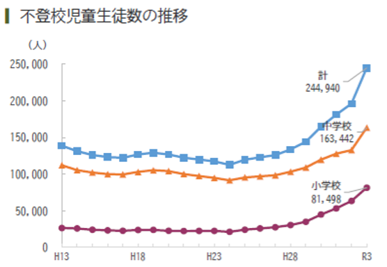 これまで不登校は中学生や高校生の問題だと思われていましたが、小学生の不登校が10年前に比べて3.6倍にまで増え、不登校が若年化しています。