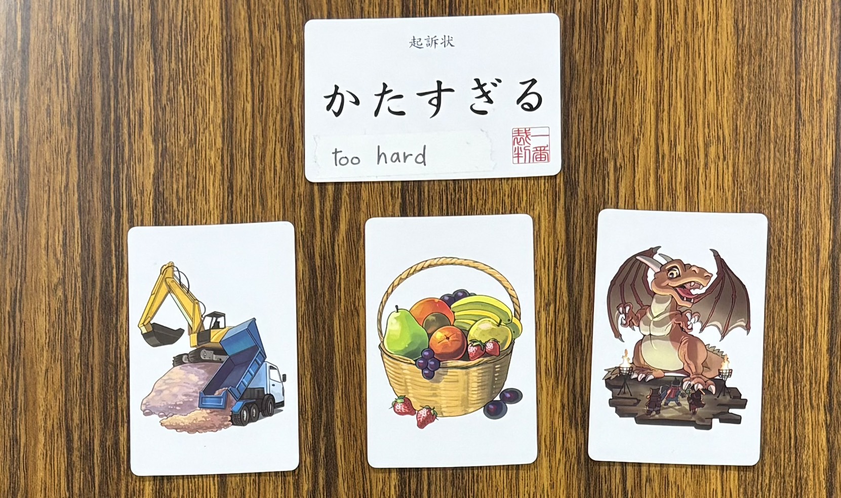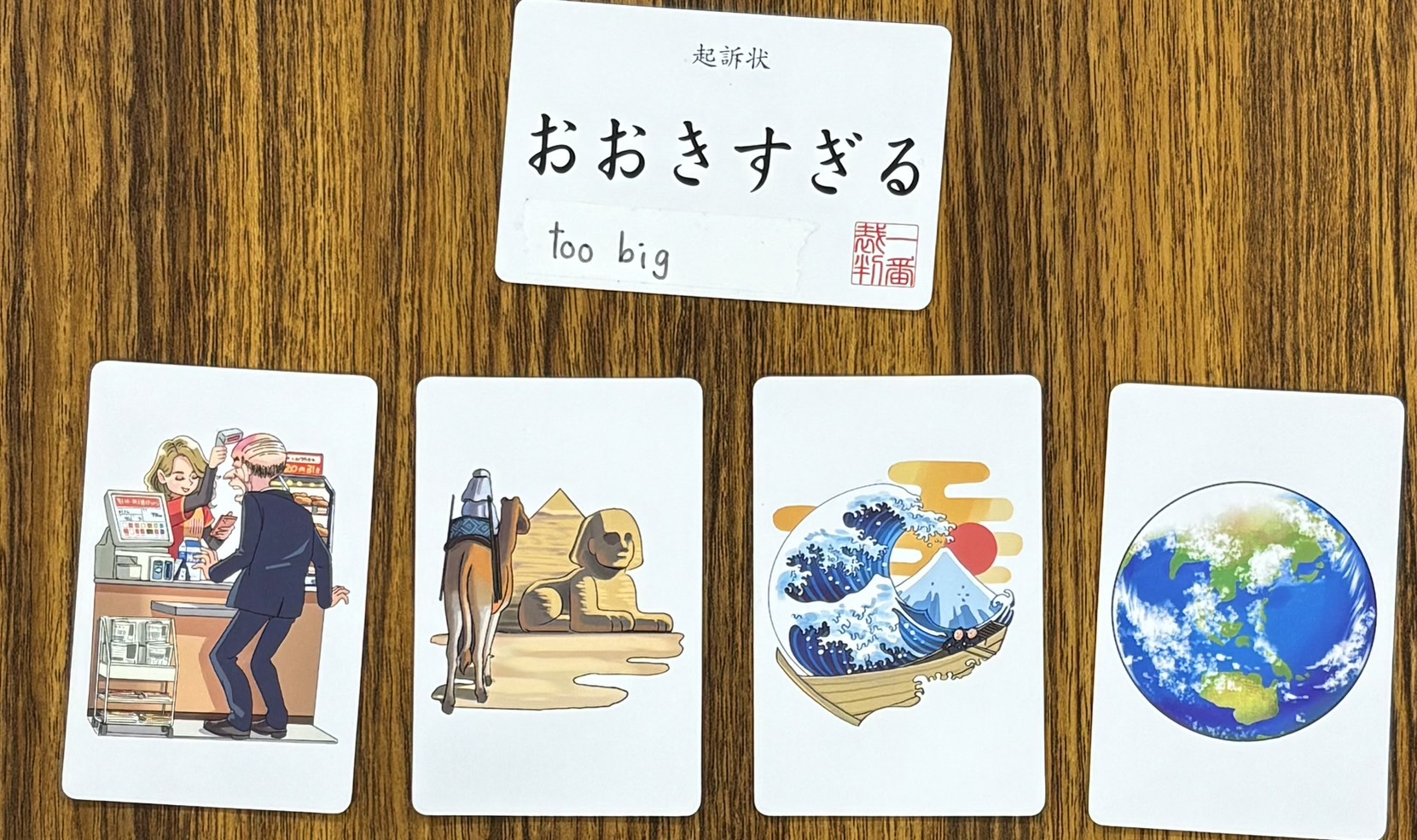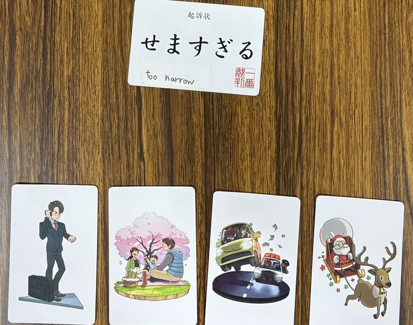 ボードゲーム『一番裁判』は検事たちがお題にふさわしいピクチャーカードをそれぞれ選び、自分が選んだカードが”一番”ふさわしいと主張するゲームです。みんなの話を聞いて誰の主張が”一番”だったか決めるのは裁判官!裁判官役は本物の裁判みたいに木槌(ガベル)を叩くことができます。面白いですよ!