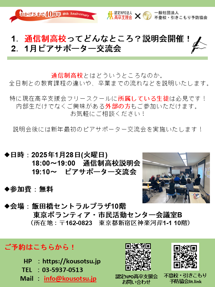 ……その前に告知です。今月1/28(火)は通信制高校の説明会があります。興味がある方はぜひ来て下さい!
