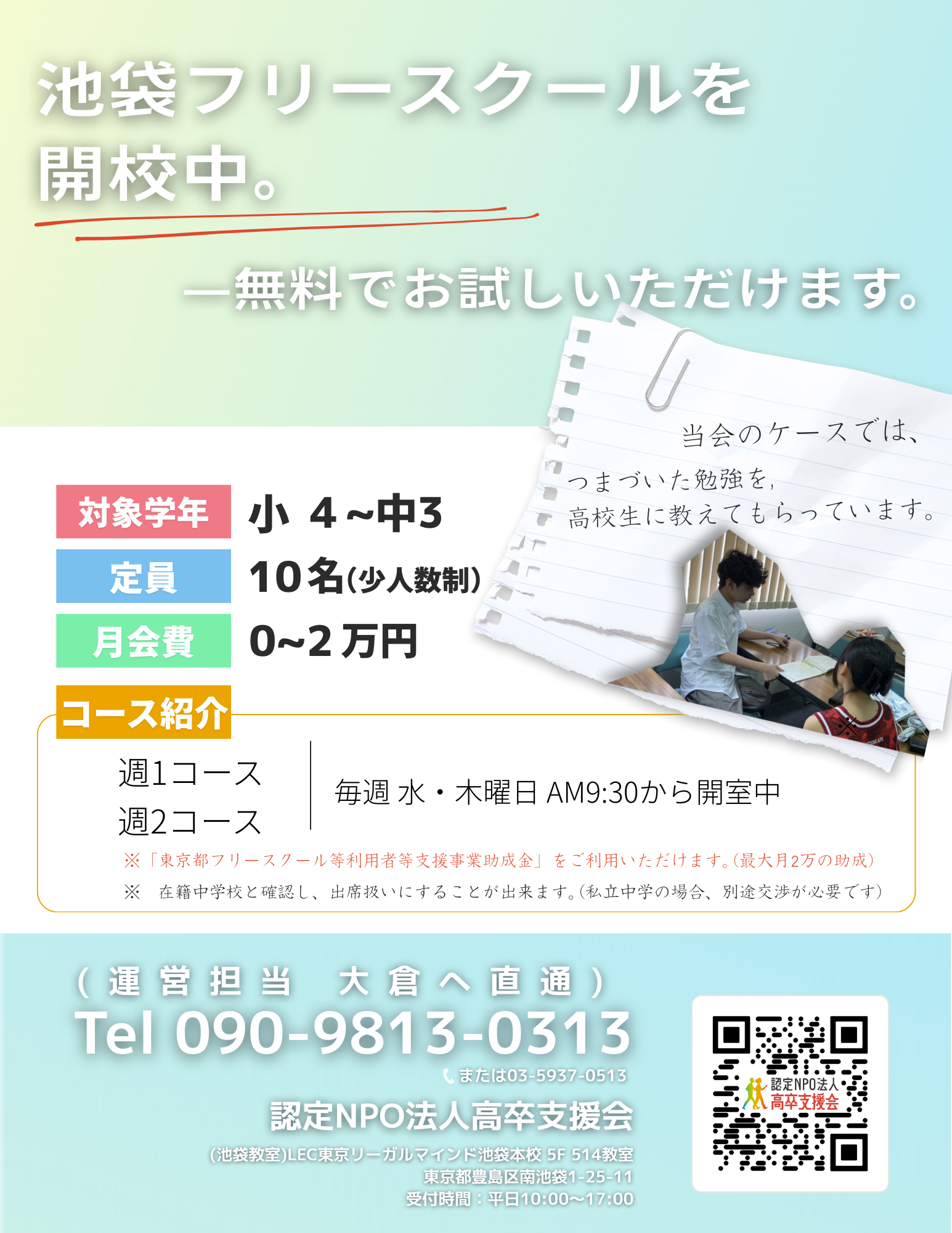池袋駅から徒歩5分というアクセス。高卒支援会では小中学生向けのフリースクールを池袋で運営しています。不登校やひきこもりで悩む子どもたちに「安心できる居場所」と「学び直しの環境」を提供し、保護者の方々とともに未来への一歩をサポートしています。