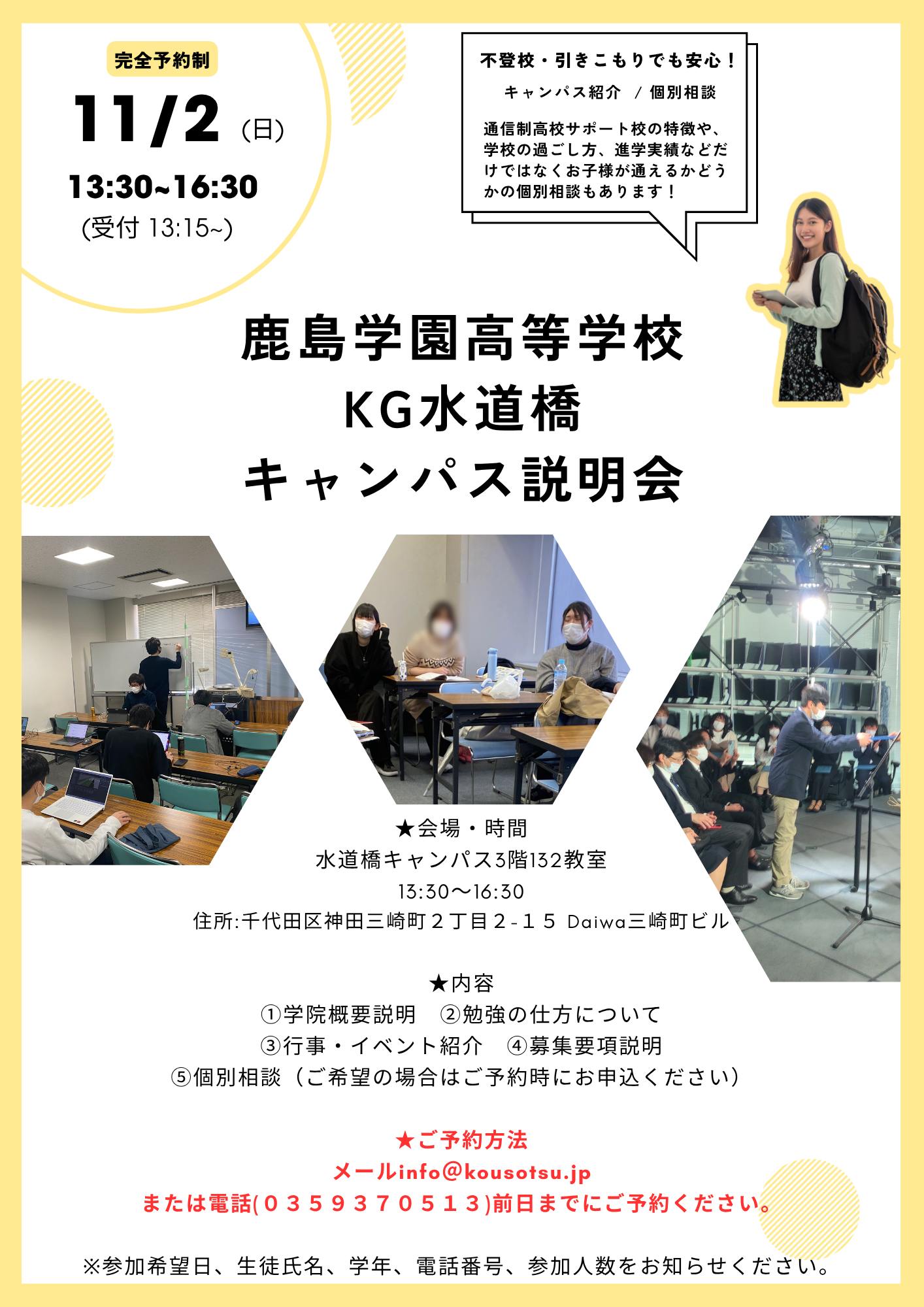 11月2日(日曜日)13時30分~16時30分 鹿島学園高等学校水道橋連携キャンパスの学校説明会を実施いたします!鹿島学園入学検討している方、通信制高校について相談したい方、不登校・引きこもりについてお悩みの方是非ご参加お待ちしております!