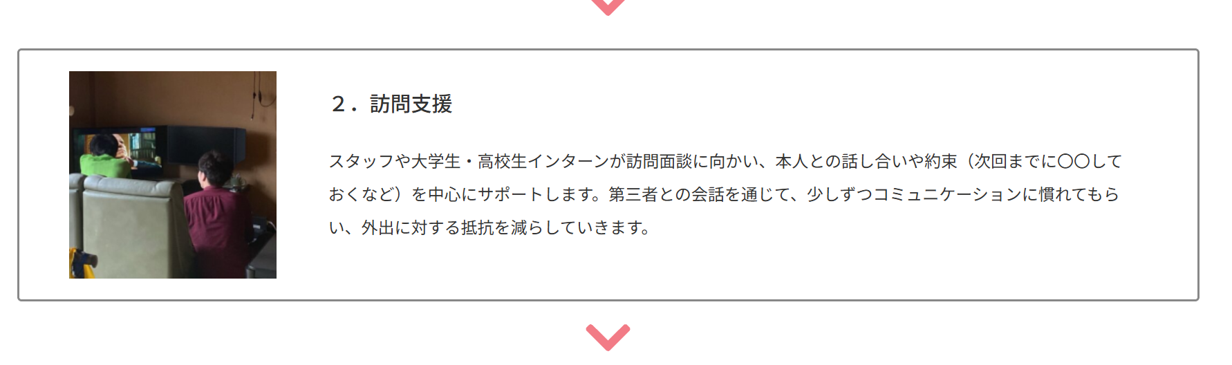 親でも先生でも医者でもない、第三者の「お兄さん・お姉さん」的な存在が訪問します。共通の趣味(ゲームやアニメなど)を通じて心の距離を縮め、「この人なら話しても大丈夫だ」という安心感を子供に与えます。